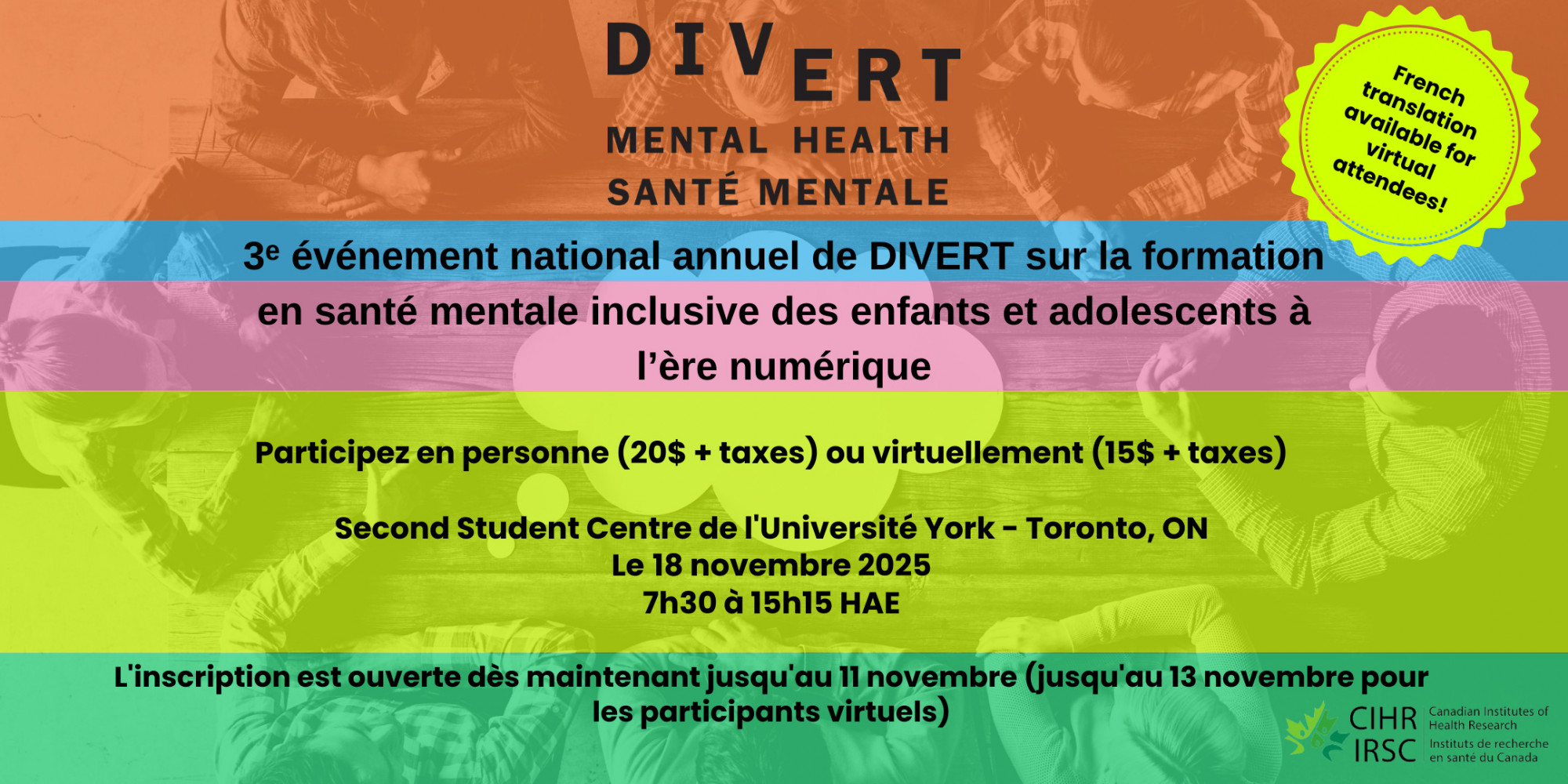 - Payez les frais d’inscription via Eventbrite avant le 11 novembre. Veuillez contacter divert@yorku.ca si vous avez des questions.